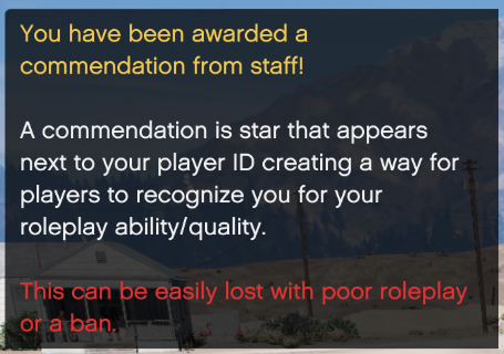 The Staff Commendation system was introduced to give staff members the ability to officially commend someone for their exceptional roleplay. The purpose of this system is to encourage players to provide a high standard of roleplay wherever they can. If a player receives a staff commendation, they will receive a message letting the player know they were commended, and they will also receive a shiny Gold Star next to their player ID when pushing z!